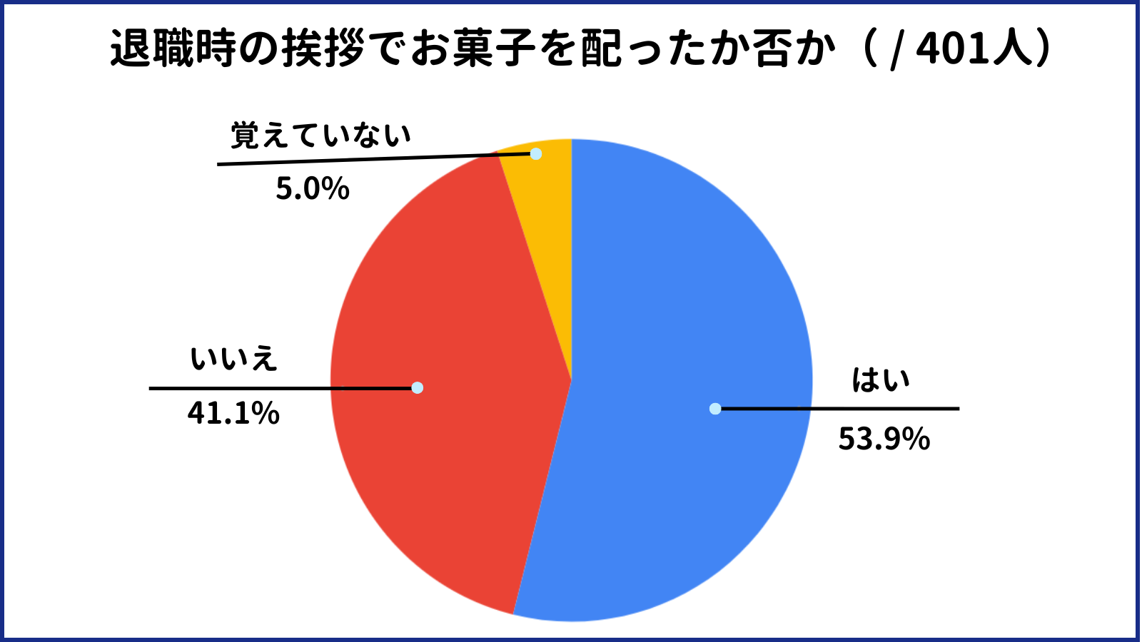 ※ リクナビネクスト 「【アンケート】転職時の退職挨拶で配るお菓子は何が良い?」の「●退職する会社で退職の挨拶をする際、お菓子を配りましたか?(n=401、単一回答)」