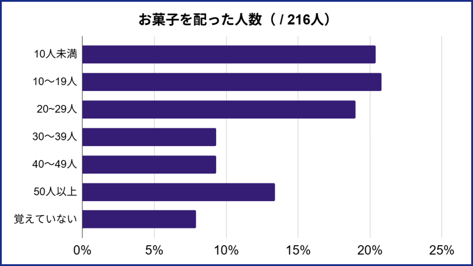 ※ リクナビネクスト 「【アンケート】転職時の退職挨拶で配るお菓子は何が良い?」の「●退職挨拶時のお菓子に費用はいくらかけましたか?(n=216、単一回答)」また、配った相手の人数は30人程度が平均だとのことです。