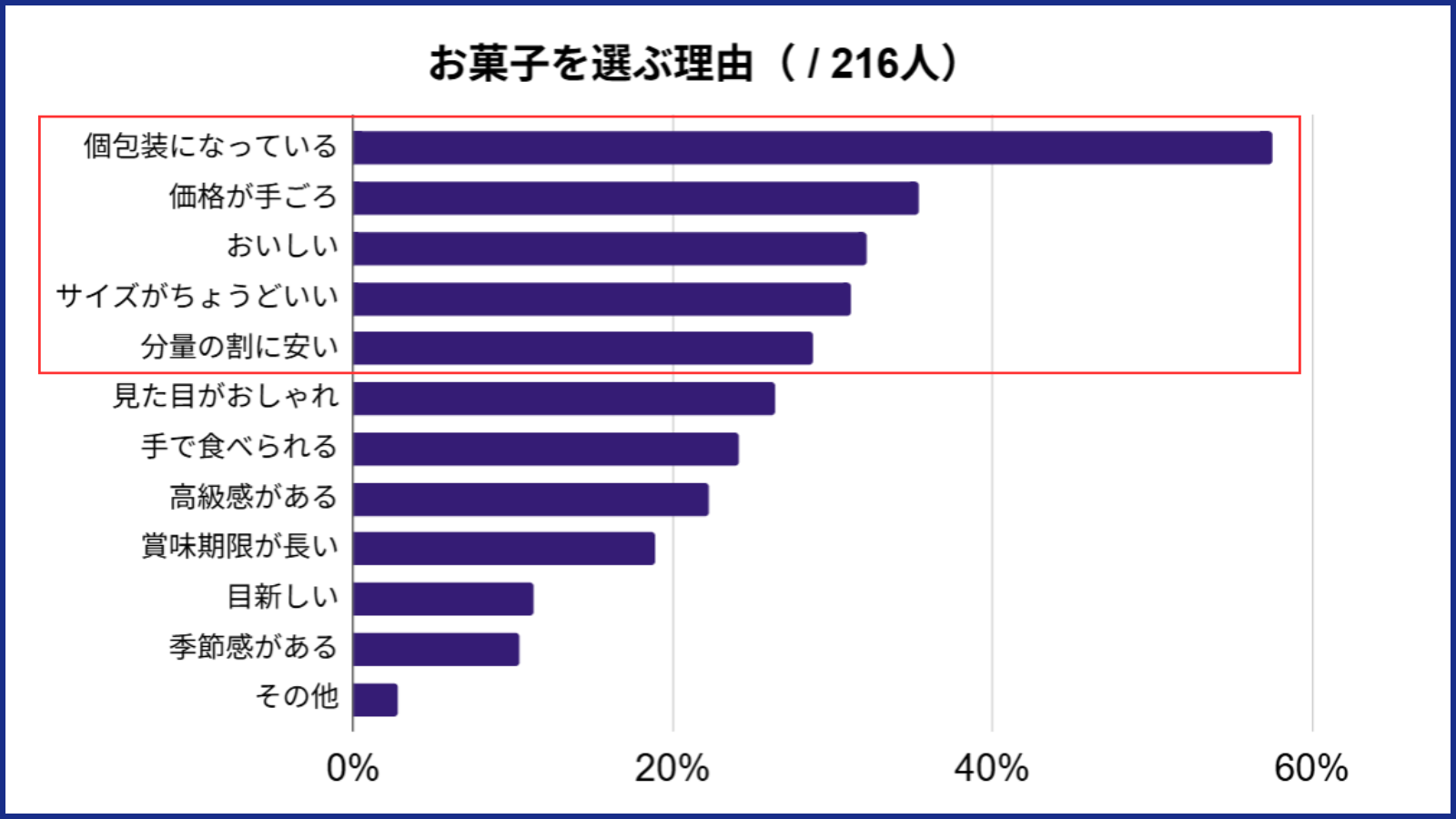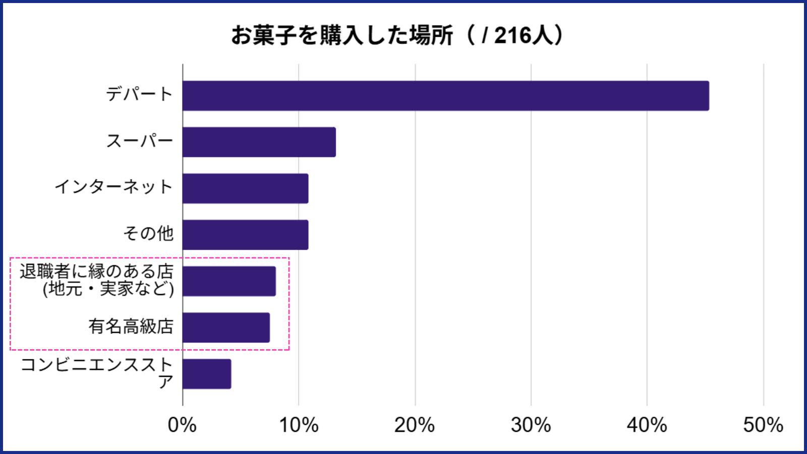※ リクナビネクスト 「【アンケート】転職時の退職挨拶で配るお菓子は何が良い?」の「●退職挨拶時のお菓子はどこで購入しましたか?(n=216、単一回答)」安く、美味しく、個包装なら問題ない